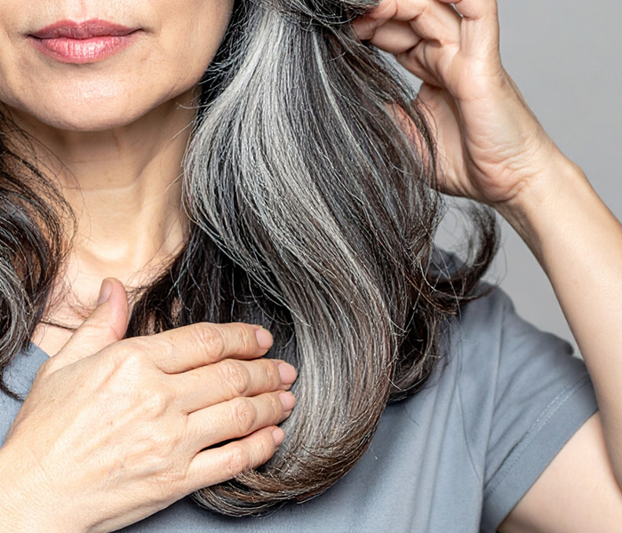 ポラリスはヘアカラーにもこだわりを持って施術にあたっています。特に明るい白髪染めに力を入れており、最近は白髪でお悩みのお客様が多くご来店くださっています。多くの方が「白髪を染めたいけど暗くなるのはちょっと」とおっしゃいます。(もちろん髪をいためずに暗くすることも可能です。)お客様の髪の太さやダメージの度合いに合わせ、2~3種類のカラー剤を塗り分けています。白髪染めとオシャレ染めは別の薬剤で、それぞれの特性に合わせて調合することで、髪をきれいに染め上げます。